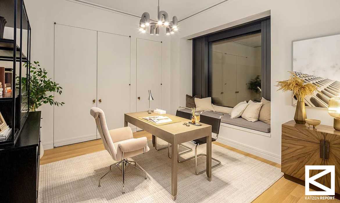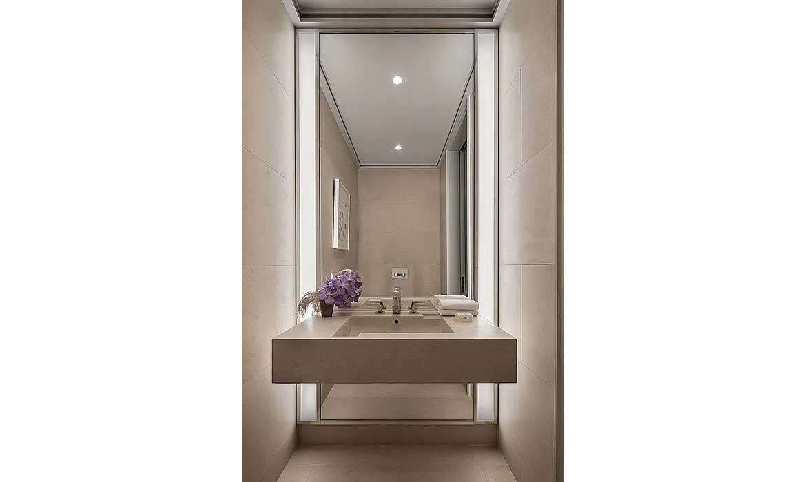 The primary suite offers south- and west-facing views; multiple closets including one walk-in; and spa-like ensuite bathroom that blends tradition and originality. Elegantly appointed in polished Noir St. Laurent marble, high-honed Verona limestone, and polished Persian golden travertine with polished nickel Dornbracht fixtures throughout, the primary bathroom features two separate vanities with custom Thierry Despont-designed polished nickel automated mirrors, a cast iron Lefroy Brooks soaking tub, freestanding shower, radiant heated floors, and private water closet. Two additional bedrooms-one facing north and the other south-each offer an en suite bathroom clad in high-honed Verona limestone with polished nickel Dornbracht fixtures. Completing the residence is a beautifully appointed powder room and a discreet utility closet with washer and vented dryer. No detail has been overlooked, from the custom interior lighting designed by Thierry Despont in collaboration with Schwinghammer, to the motorized Lutron solar shades with additional blackout shades in select locations, to the supply of humidified and filtered fresh air throughout the home.